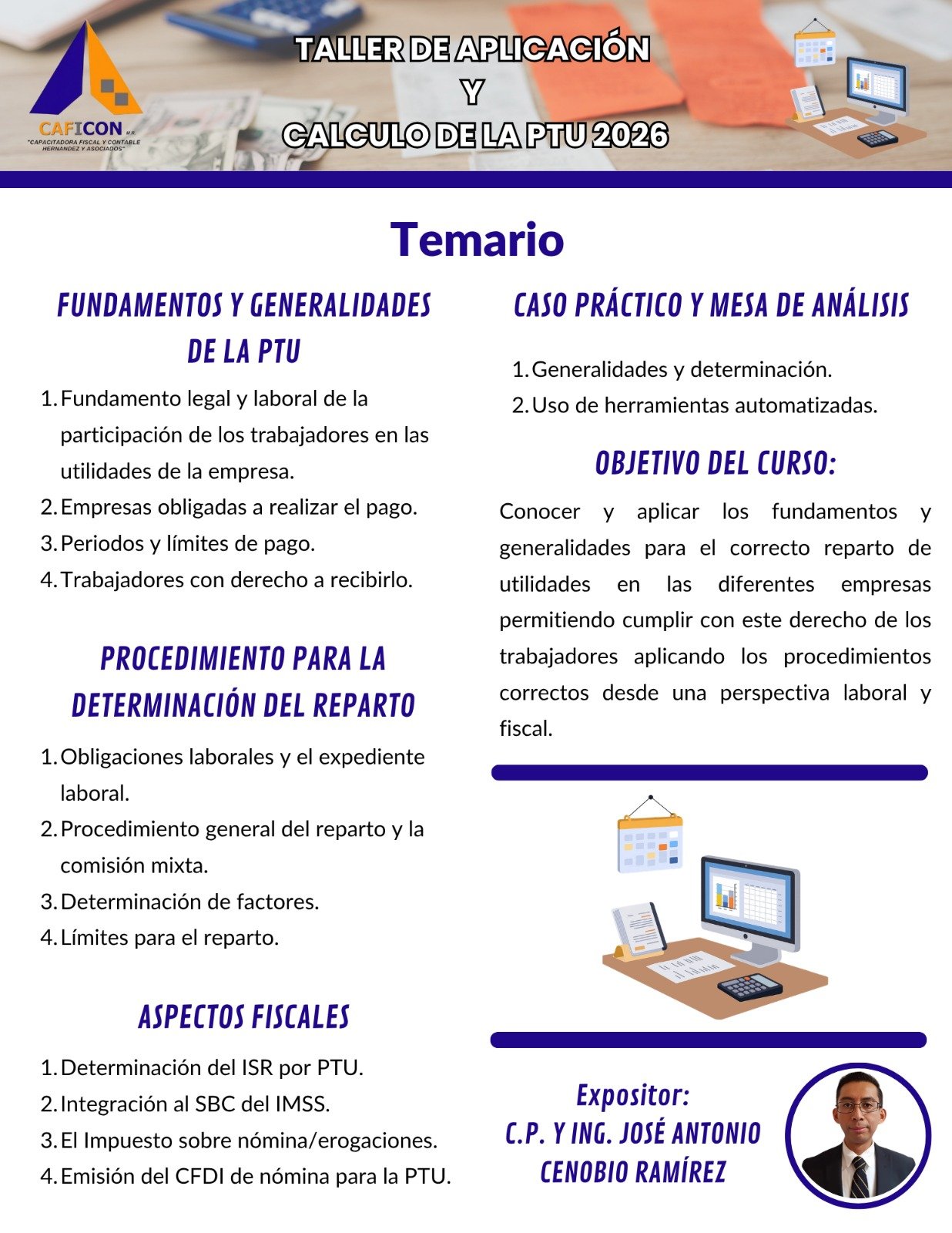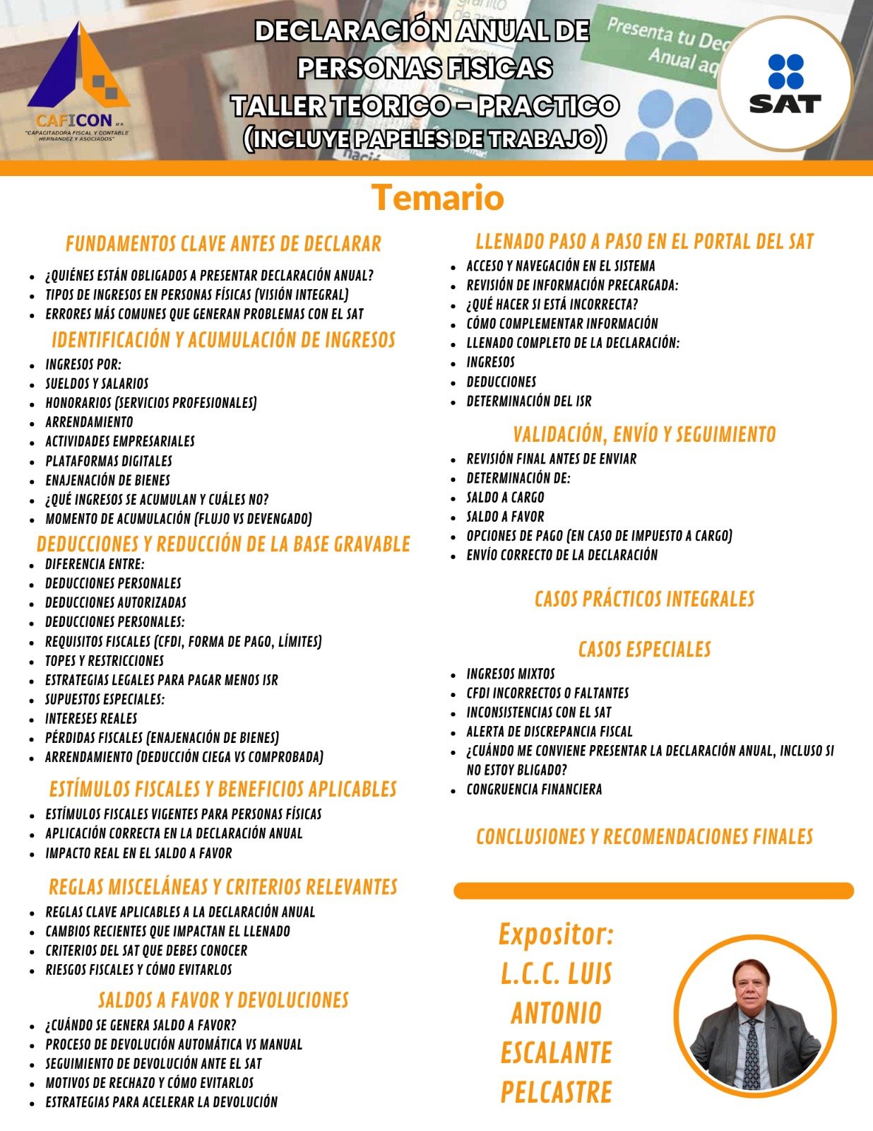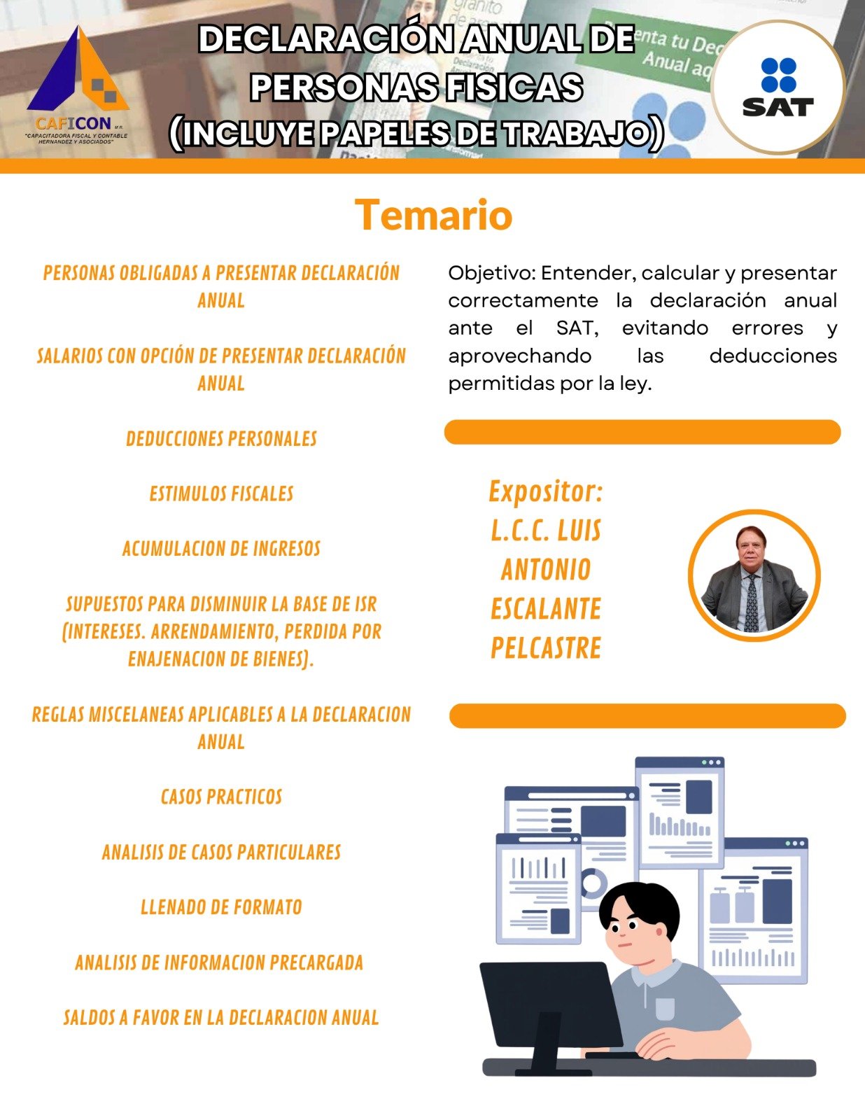 Nuestros cursos combinan teoria y practica, impartidos por especialistas con amplia experiencia, para brindarte herramientas claras, actuales y aplicables a la realidad profesional. Dirigido a contadores, administradores, empresarios y profesionales que buscan minimizar riesgos, optimizar procesos y actuar con seguridad juridica.